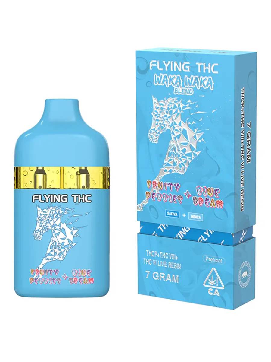 Dive into a dreamy, fruity paradise with the Fruity Pebbles + Blue Dream Flying Horse THC Waka Waka Blend Disposable 7G. This delightful disposable vape blends the iconic sweet, berry flavors of Fruity Pebbles with the calming, euphoric effects of Blue Dream, creating an exquisite and balanced cannabis experience.