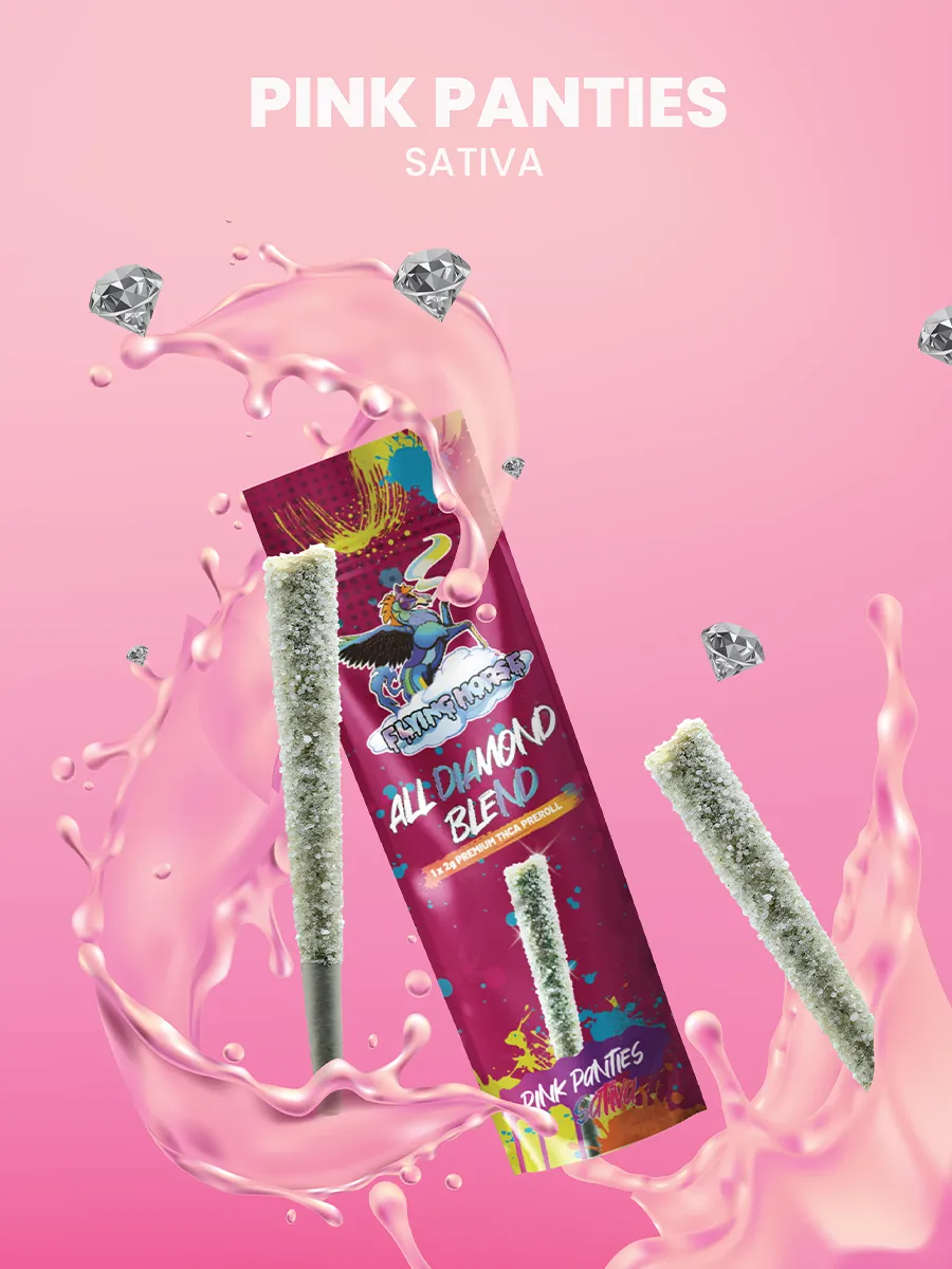 The Pink Panties Flying Horse All Diamond Blend THCA Pre-Roll 2G offers a luxurious and potent cannabis-smoking experience. Unique to the market, these pre-rolls are the first-ever ALL DIAMOND PREROLL, redefining what it means to get iced out while keeping a nostalgic, true-to-culture cannabis experience. Each 2G pre-roll is crafted with premium hemp, infused with THCA diamonds, glazed with liquid diamonds, and rolled and dusted with Kief.