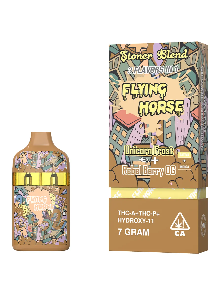 Dive into the enchanting world of Unicorn Frost and Rebel Berry OG with the Flying Horse Stoner Blend Disposable. This premium 7G disposable vape blends the mythical sweetness of Unicorn Frost with the bold, berry flavors of Rebel Berry OG, offering a vibrant and uplifting experience that’s perfect for both relaxation and creative endeavors.