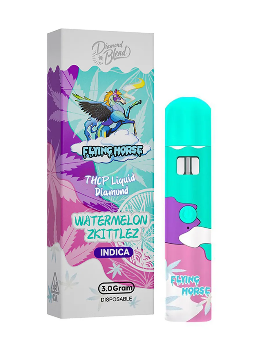 Get ready for a flavorful burst of fruity goodness with the Watermelon Zkittlez Flying Horse THC-P Liquid Diamond Disposable 3G. Infused with THC-P Liquid Diamonds, this premium disposable vape delivers a refreshing combination of sweet watermelon and the candy-like essence of Zkittlez. Known for its uplifting and calming effects, Watermelon Zkittlez offers the perfect balance of relaxation and mood elevation. Whether you’re winding down after a long day or seeking a moment of sweetness, this 3-gram disposable provides a smooth and potent vaping experience.