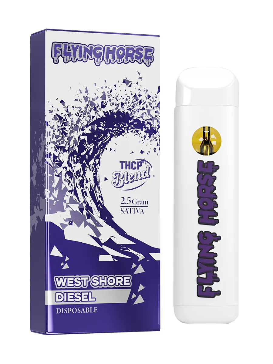Experience the bold flavor and energizing effects of the West Shore Diesel Flying Horse THCP Blend Disposable 2.5G. Order now from our online headshop, Olofly, and elevate your vaping journey today!
